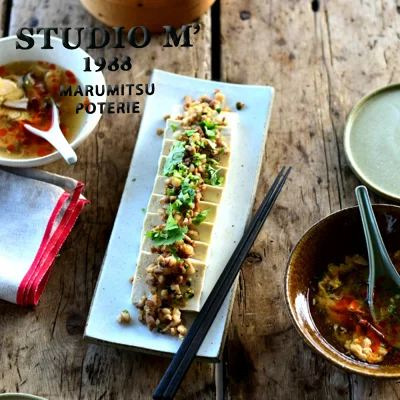 脚付たたらは、切りっぱなしの断面が土の素朴な表情をそのまま映し出し、盛り付け面のコントラストが美しく際立つ器です。この9寸長盛皿は、素材や形状に由来する強さと優…