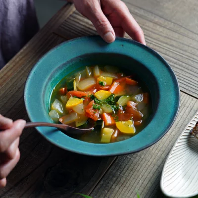 美しいターコイズブルーの釉薬が施された、シンプルでナチュラルな益子焼のリム鉢です。このRimmed Bowlは、シチューやスープ、パスタ、煮込み料理など、様々な…