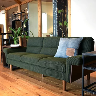 モスグリーンのコーデュロイ生地がモダンな雰囲気を演出するA.BFLYの3人掛けソファです。このソファは、吸湿性が高く、表面をさらりと保てる太幅のコーデュロイ生地…