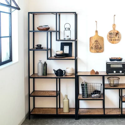 アイアンとダメージ加工のマンゴー無垢材を使用した、味わい深いヴィンテージ感あふれるオープンシェルフです。このシェルフは、あえて不規則に棚を配置することで、モダン…