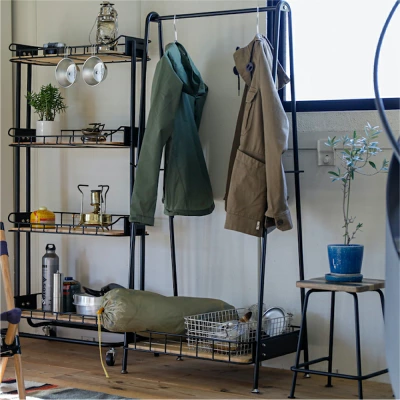 ヴィンテージやアウトドア、リビング、ガレージなど、様々な空間にマッチするオイルステン仕上げのスチールハンガーです。パインウッドとアイアンの組み合わせが、インダス…