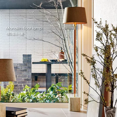 ART WORK STUDIOのMonolith Floor Lampは、麻綿のシェード、オーク無垢材のポール、そして無数の細孔が特徴的な大理石トラバーチンを使…
