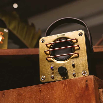 渋めゴールドのスピーカー前面、ブラックの本体に耐久性のあるレザーストラップ、レトロな雰囲気が漂うBAREBONESのワイヤレススピーカーです。もちろん中身は最新…